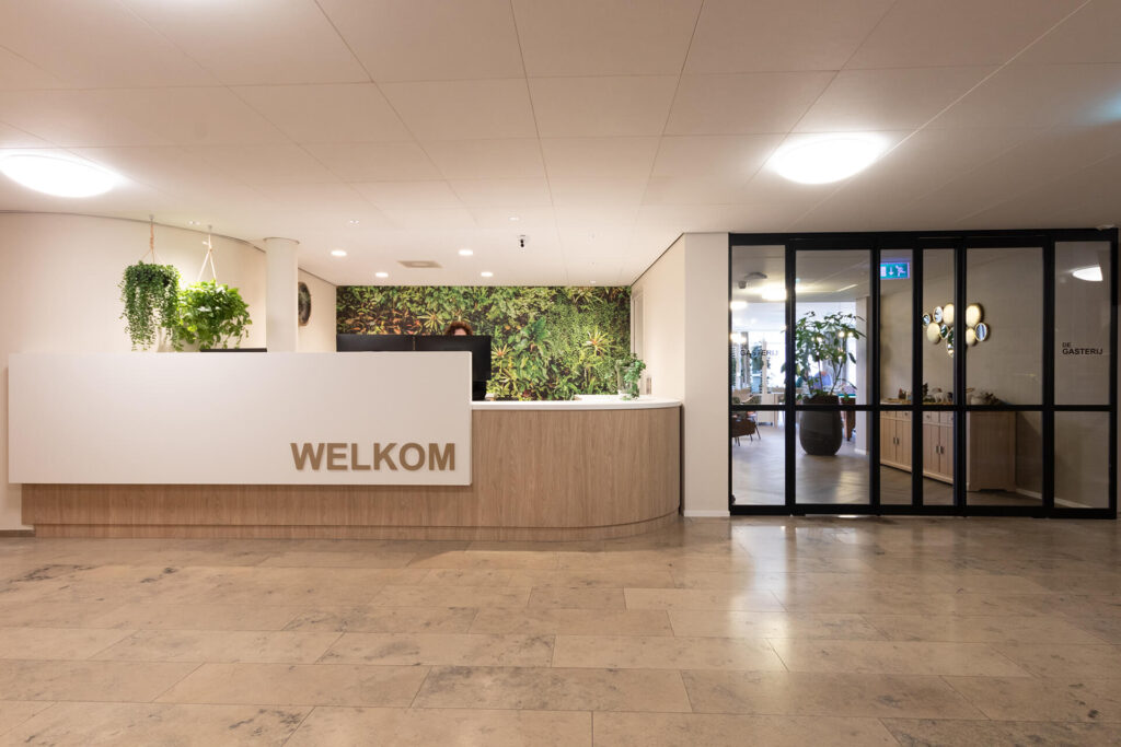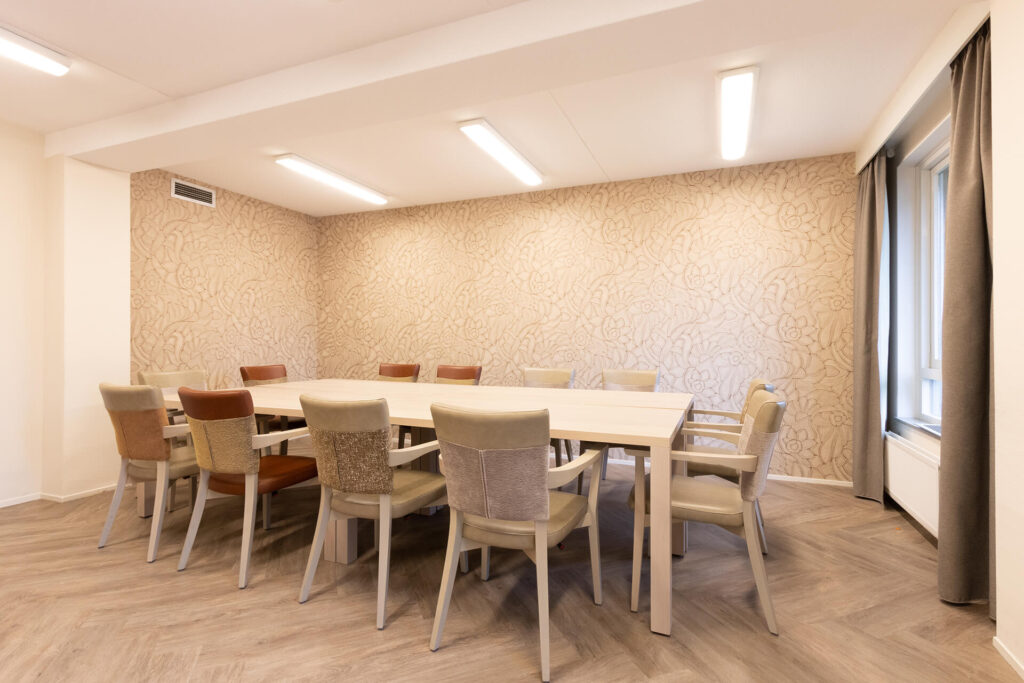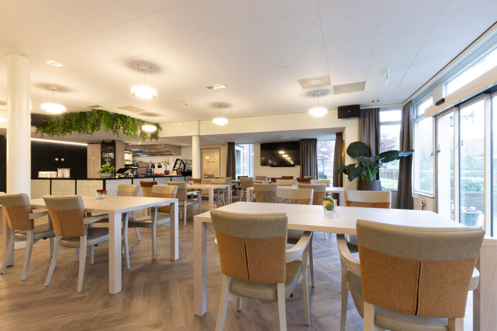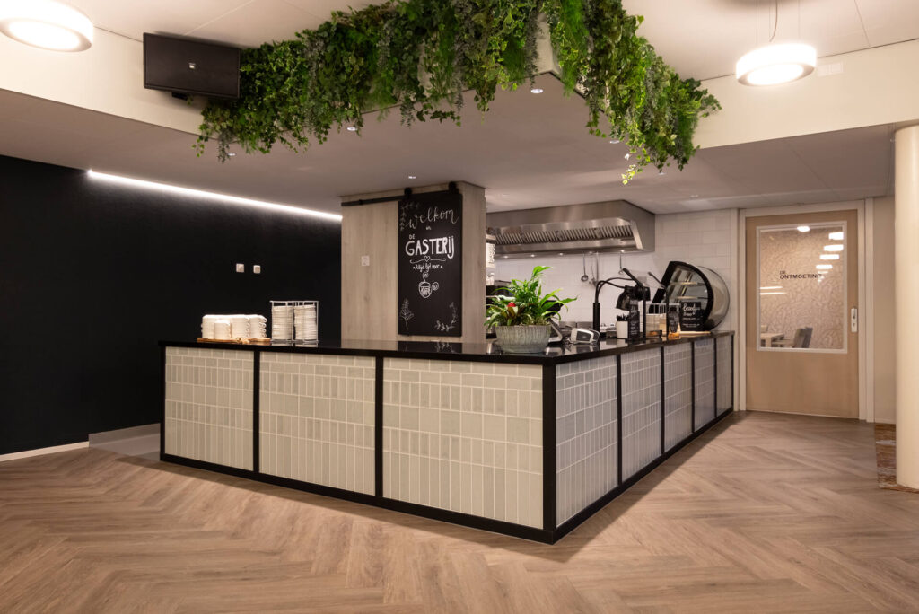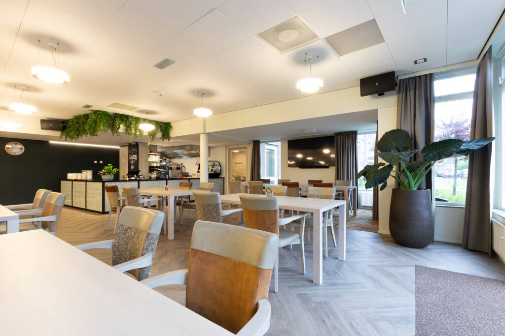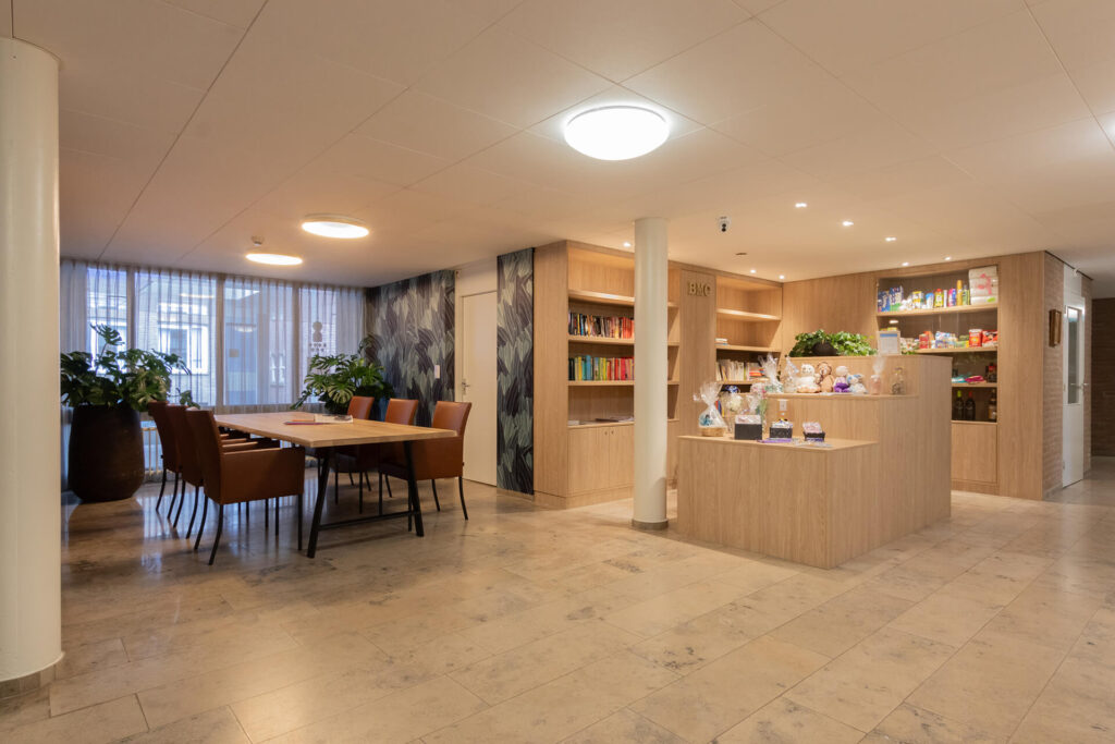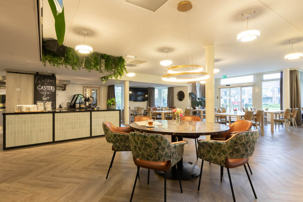 Huize Elisabeth: a contemporary residential care centre Right in the centre of Vught, on the spot where nuns used to care for patients and read their daily breviary, is now the contemporary residential care centre Huize Elisabeth. At this location, care organisation Vughterstede - a warm community of clients, informal carers, volunteers and professionals with a heart for good care - wanted to create a cosy, functional and hospitable atmosphere for its residents. Hospitality atmosphere To fulfil this wish, Lensen supervised the total project design and provided window coverings, wall finishes, flooring, custom-made furniture and attractive greenery,' explains Annick Hornman, account manager Care Cure. 'My colleague Anny van Sas, interior designer at deStudio van Lensen, signed for the design and gave the entrance and restaurant the much-desired, welcoming hospitality look. The entrance is the first introduction to Huize Elisabeth and therefore an important space to convey the vision and atmosphere of the organisation. The attached restaurant is a space where meeting each other is central. We provided both spaces with a whole new look and atmosphere.' Contemporary The beautiful, existing marble floor in the entrance naturally gives a lot of character to the space. The atmosphere of this authentic floor is enhanced with the use of modern materials and steel doors. This combination gives the space a warm, contemporary feel. ‘In the design, we gave the reception desk a new place so that you are immediately warmly welcomed upon entering,’ Anny further explains. Opposite the reception desk, we designed a shop unit with custom-made cupboards and a presentation unit. At the spacious standing table with comfortable chairs, people can sit quietly, wait or meet.' Connection Generous, black, steel doors with clear glass provide access to the renovated restaurant. 'The attractive design of these doors visually invites you into the restaurant. On the floor, a modern herringbone emphasises the contemporary look and the serving counter has also become a real eye-catcher. Beautiful tiles in various sizes and shapes are playfully patterned. Anthracite styles add a punch to the furniture and emphasise its functionality.' The restaurant itself is attractively situated on the garden and the many windows provide light and openness. 'As the space looks light by itself, we tailored the use of fabrics and materials accordingly. Light-coloured tables with stylishly upholstered chairs in different shapes, colours and designs. The round table has a marble decor HPL top, which provides a nice contrast to the light tables and at the same time connects to the marble floor in the entrance.'