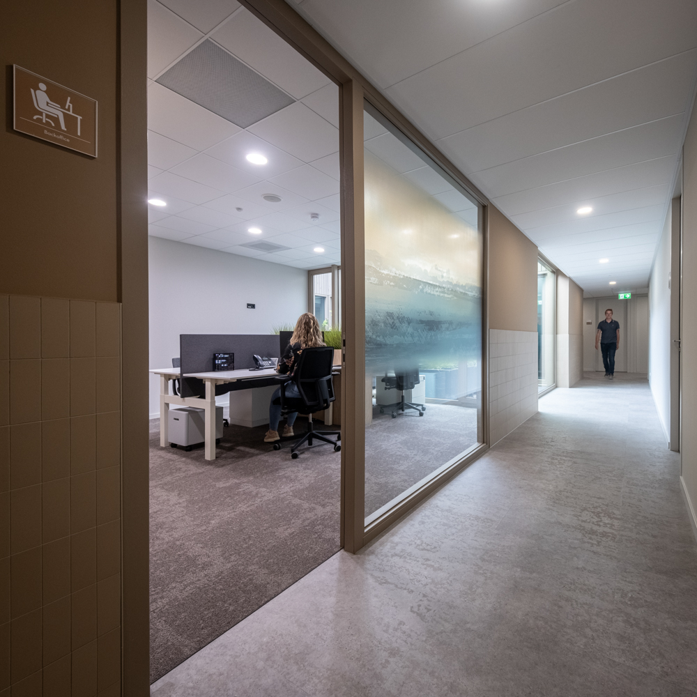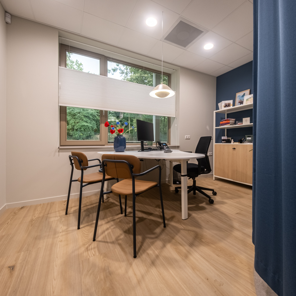 In de behandel- en werkruimtes staat het groene palet centraal. Het zorgt voor rust, focus en een veilig gevoel. Medewerkers ervaren er een gebalanceerde, lichte werkomgeving met voldoende ruimte voor persoonlijke accenten. De keuze voor duurzame materialen en slimme indeling draagt bij aan werkcomfort en toekomstbestendigheid.