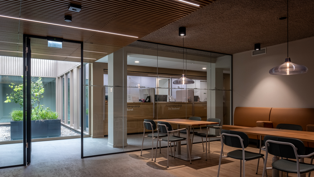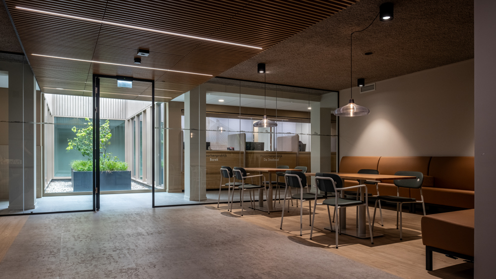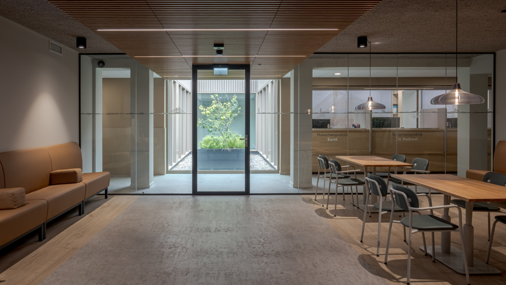 Wachtruimtes en gedeelde zones zijn ingericht met zit-nissen, warme stoffering en natuurlijke materialen. De sfeer is uitnodigend, huiselijk en gericht op sociale interactie. Functioneel en esthetisch gaan hier hand in hand: de akoestiek is geoptimaliseerd en de routing is duidelijk.