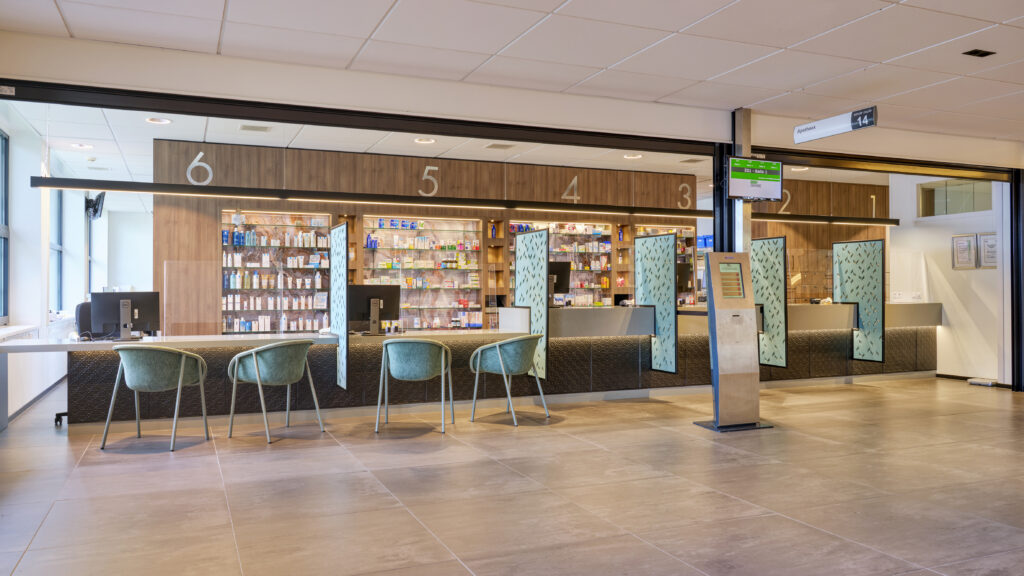 Naast de sfeer is ook de routing in het ziekenhuis een erg belangrijk gegeven. De ontvangsthal is het knooppunt voor vijf gangen en de Ontmoeting. Miranda: ‘Om deze routing te versterken hebben we ‘groene daken’ aangebracht. Deze rasters met groen verbinden de uitgifte met de zitgelegenheid, zijn sfeervol en geven de ruimte geborgenheid. Ook de apotheek is - door de diversiteit aan materiaalgebruik - een plaatje. De apotheek heeft een wengé kleur als front in combinatie met staal en olijfgroen in de scheidingswanden.’