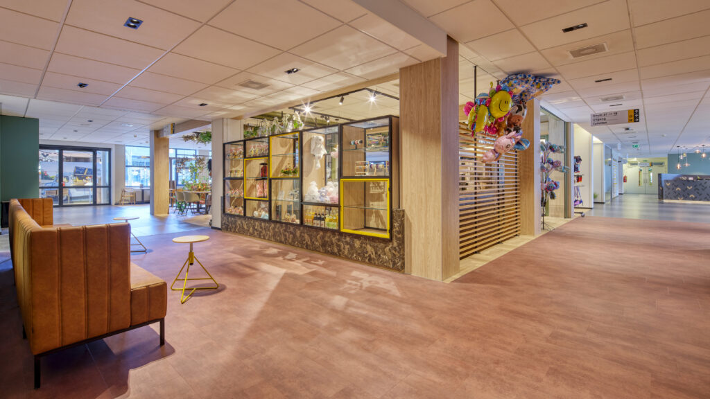 ‘Net als de Ontmoeting is de hal erg toegankelijk, overzichtelijk en zijn er naast de basis enkele eyecatchers opgenomen’, licht Miranda toe. ‘Anna heeft vooral een heel open karakter. Direct bij binnenkomst word je warm begroet door vrijwilligers en medewerkers. Er heest een relaxte sfeer, zeker voor een ziekenhuis. Die ambiance is het beste te omschrijven als een warme jas, tijdloos, prikkelend en toch rustig. Qua materialen en kleuren is gekozen voor een rustige basis met enkele in het oog springende accenten. Hierbij gaat om de tactiliteit en niet om beelden of patronen. We hebben gespeeld met texturen en kleuren, die elkaar versterken.’
