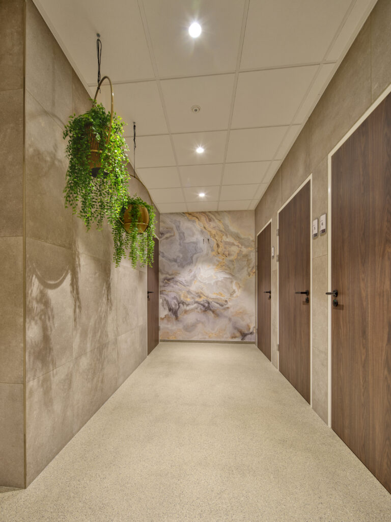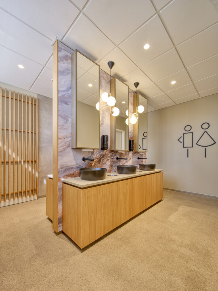 Een belangrijk uitgangpunt is dat het ziekenhuis voor iedereen in Geldrop en omgeving toegankelijk en herkenbaar is en dat de sfeer in de ontvangsthal aansluit bij de rest van het ziekenhuis. Niet doorsnee en divers van karakter. ‘Door genoeg ruimte te geven aan de mensen zelf en de keuze voor mooie basismaterialen blijft de sfeer dicht bij de bezoeker en medewerkers,’ vertelt Miranda. ‘Ondanks dat het ontwerp niet doorsnee is, blijft het toegankelijk en is er ruimte voor verwondering. Een mooi voorbeeld zijn de toiletten. Deze hebben een hoteluitstraling gekregen met bollampen in goud, marmerlook en ovale spiegels. Hierbij zijn we afgestapt van de standaard prullenbakken en dispensers door te kiezen voor goed interieurmaatwerk. De dispenser is weggewerkt achter de spiegel, de prullenbakken zijn in het meubel ondergebracht en er zijn stijlvolle zwarte kranen en waskommen toegepast.’