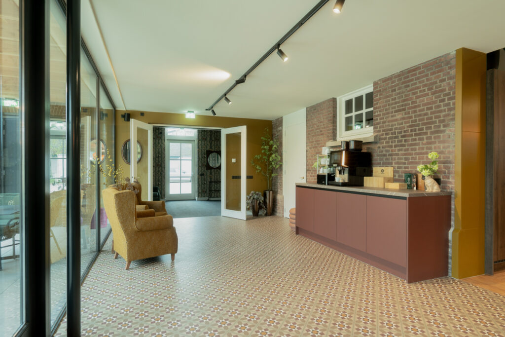 Wat het ontwerp van het Tuinhuis bijzonder maakt? ‘Dat alles klopt,’ zegt Eveline. ‘Van behang tot meubelen: het is één geheel. Alles is op elkaar afgestemd, tot in de kleinste details. Dat voel je als je er bent.’ Die samenhang zorgt ervoor dat bewoners én bezoekers zich welkom voelen. ‘We horen vaak: ‘Als dit een zorghuis is, wil ik hier ook wel wonen.’ Dat is toch het mooiste compliment dat je kunt krijgen.’