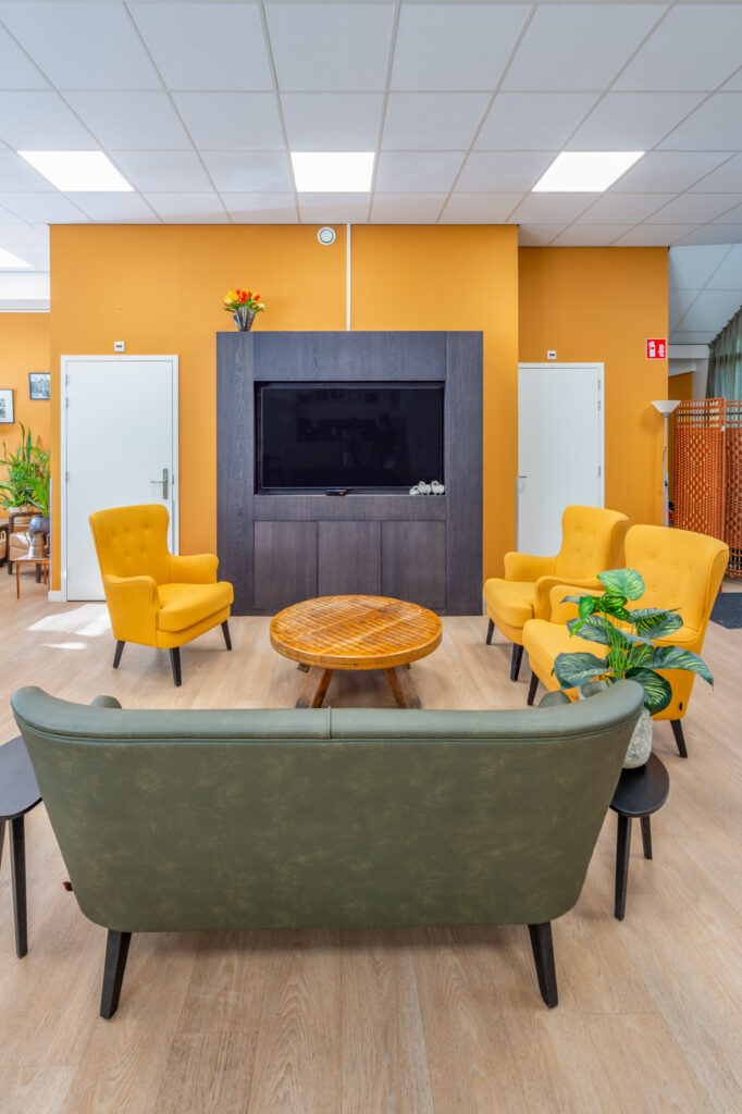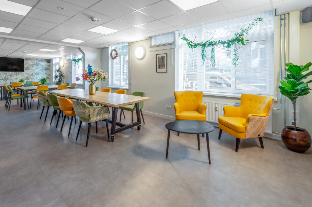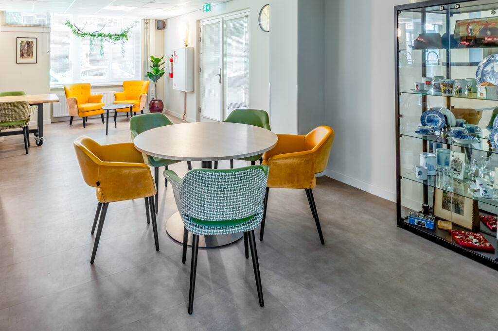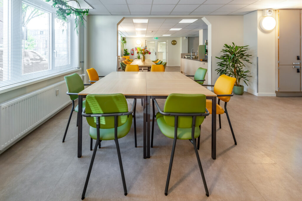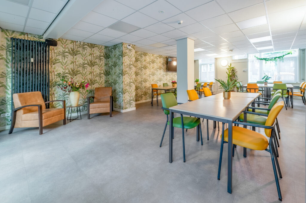 De dagopvang op de begane grond vormt het kloppend hart van het gebouw. Grote ramen laten daglicht binnenstromen, terwijl warme stoffering en doordachte verlichting zorgen voor een gastvrije uitstraling. Verschillende zithoeken stimuleren ontmoeting zonder drukte te creëren en ondersteunen een duidelijke routing in de ruimte. Jolanda: “Deze ruimte is licht, open en flexibel. Bewoners kunnen hier activiteiten doen of gewoon samen zijn. De reacties zijn ontzettend positief.”