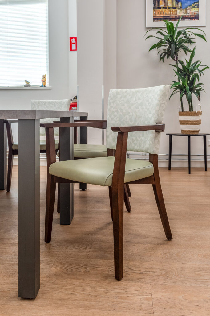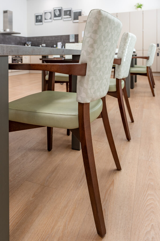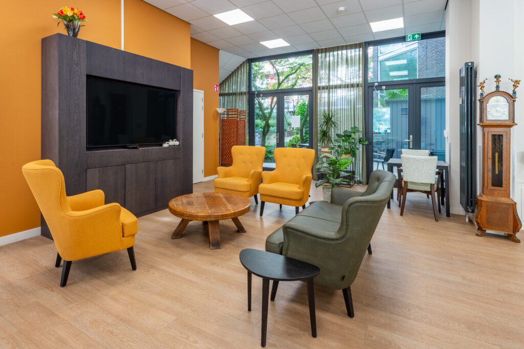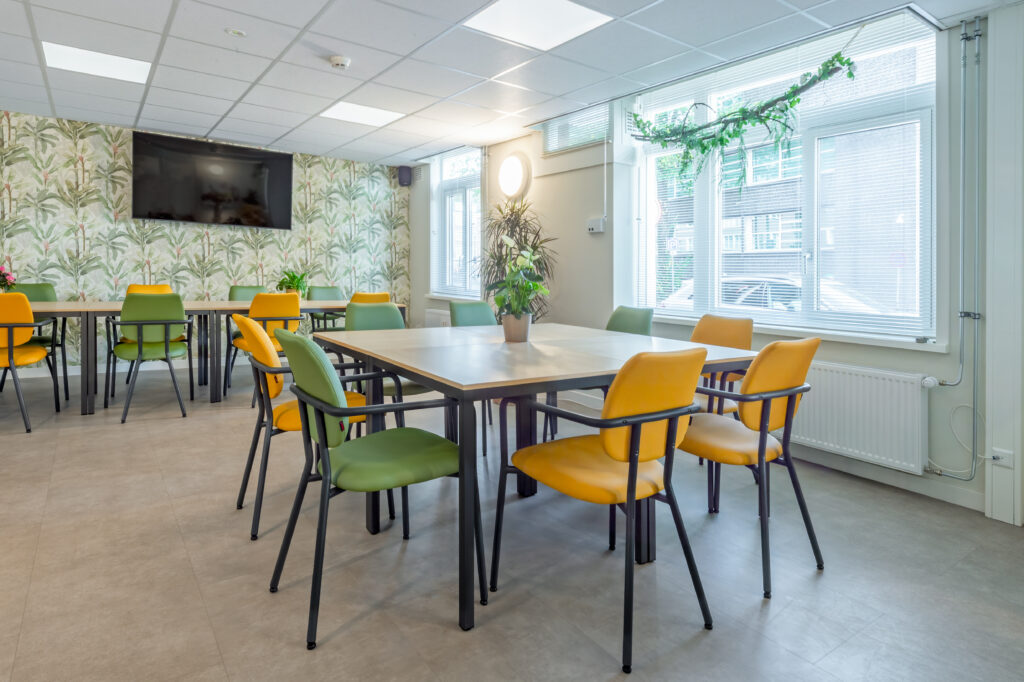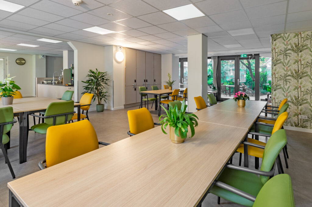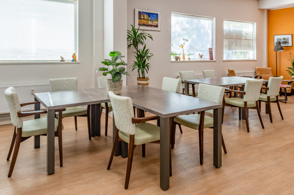 De dagopvang op de begane grond vormt het kloppend hart van het gebouw. Grote ramen laten daglicht binnenstromen, terwijl warme stoffering en doordachte verlichting zorgen voor een gastvrije uitstraling. Verschillende zithoeken stimuleren ontmoeting zonder drukte te creëren en ondersteunen een duidelijke routing in de ruimte. Jolanda: “Deze ruimte is licht, open en flexibel. Bewoners kunnen hier activiteiten doen of gewoon samen zijn. De reacties zijn ontzettend positief.”