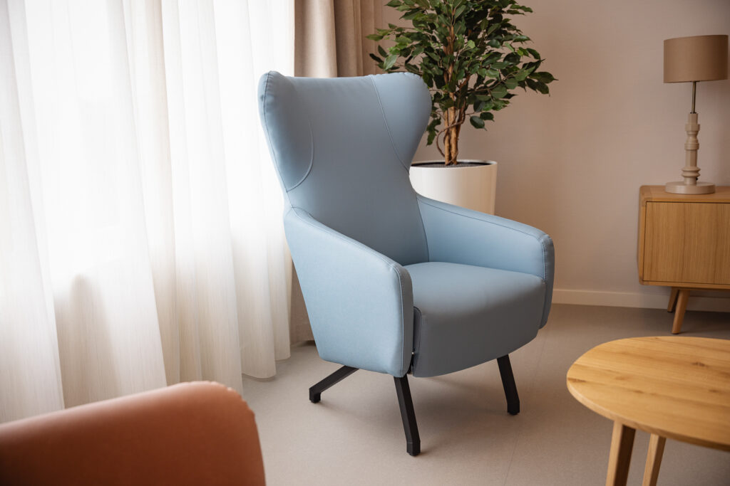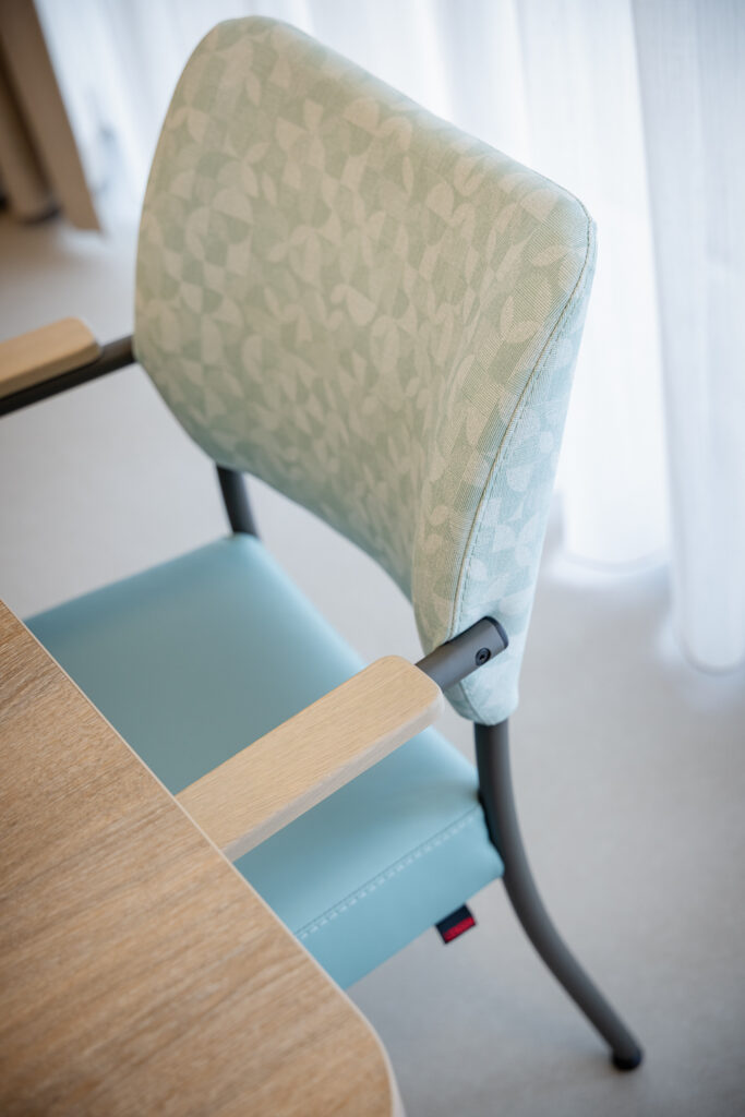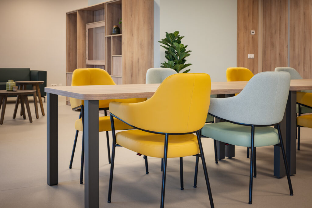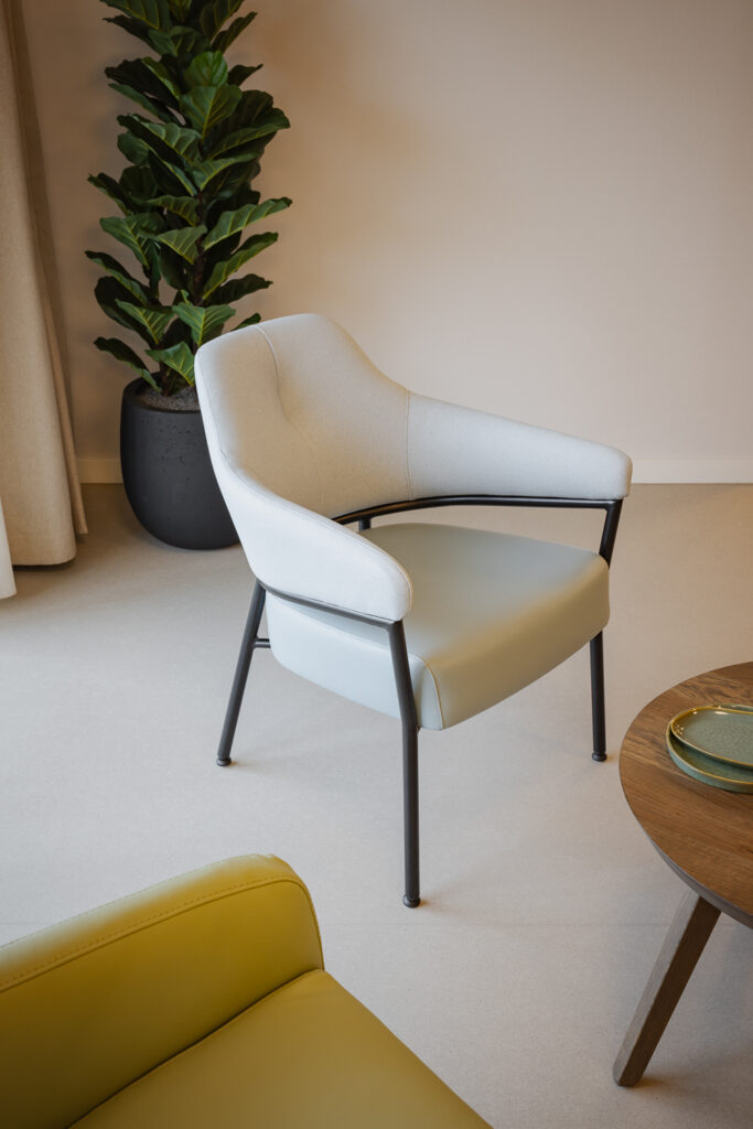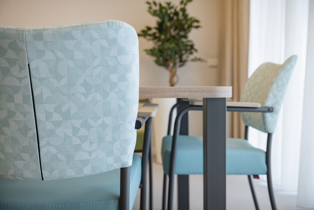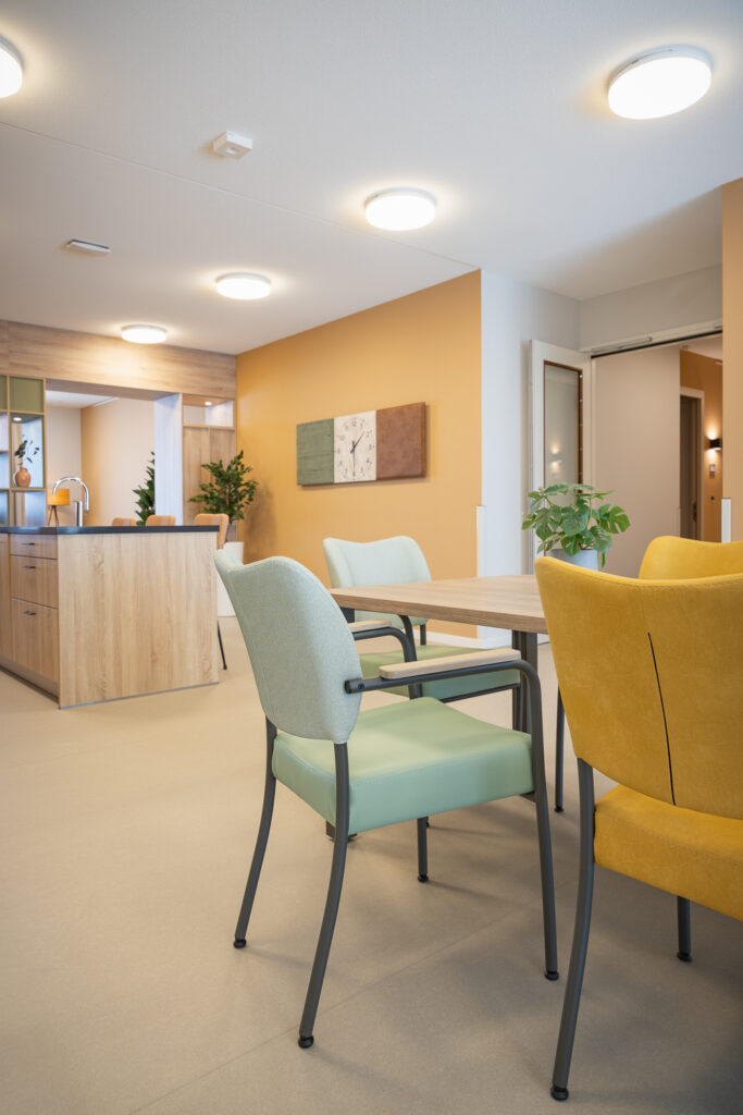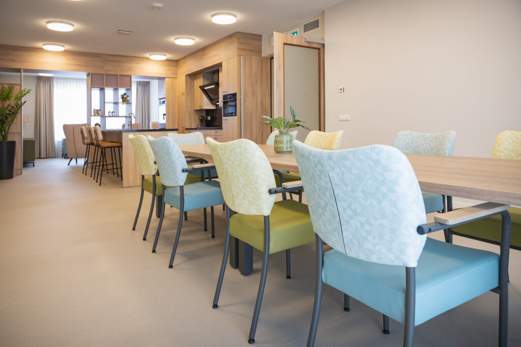 Voor de medewerkers is het meubilair naast mooi, vooral ook functioneel. Thessa: ‘Het meubilair is goed schoon te maken – iets wat voor onze medewerkers van groot belang is. Een doekje erover en de ruimte ziet er weer tiptop uit. Een functioneel detail dat in het dagelijks werk écht verschil maakt.’ De bewoners waarderen het comfort en de sfeer die de inrichting biedt. Kleine aanpassingen – zoals het bijbestellen van extra barkrukken – tonen hoe het interieur leeft en meebeweegt met het dagelijks gebruik.