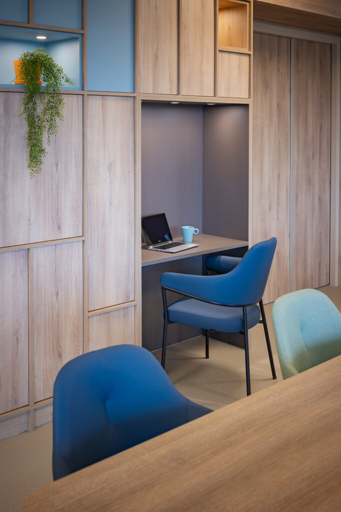 Voor het splinternieuwe woonzorgcomplex heeft Lensen het complete interieur geleverd: van meubilair en raamdecoratie tot maatwerkoplossingen. Alles in nauwe samenwerking met architect Pauwert en het zorgteam van S&L Zorg. ‘Een warme woonomgeving ontstaat niet vanzelf,’ vertelt Karen Textor, accountmanager Care bij Lensen. ‘Bij de totstandkoming van het interieur speelt de betrokkenheid van bewoners en medewerkers een centrale rol. Gezamenlijk hebben we tijdens een uitgebreid bezoek aan ons inspiratiecentrum in Zaltbommel nagedacht over kleurgebruik, materialen en de indeling van de ruimtes.’