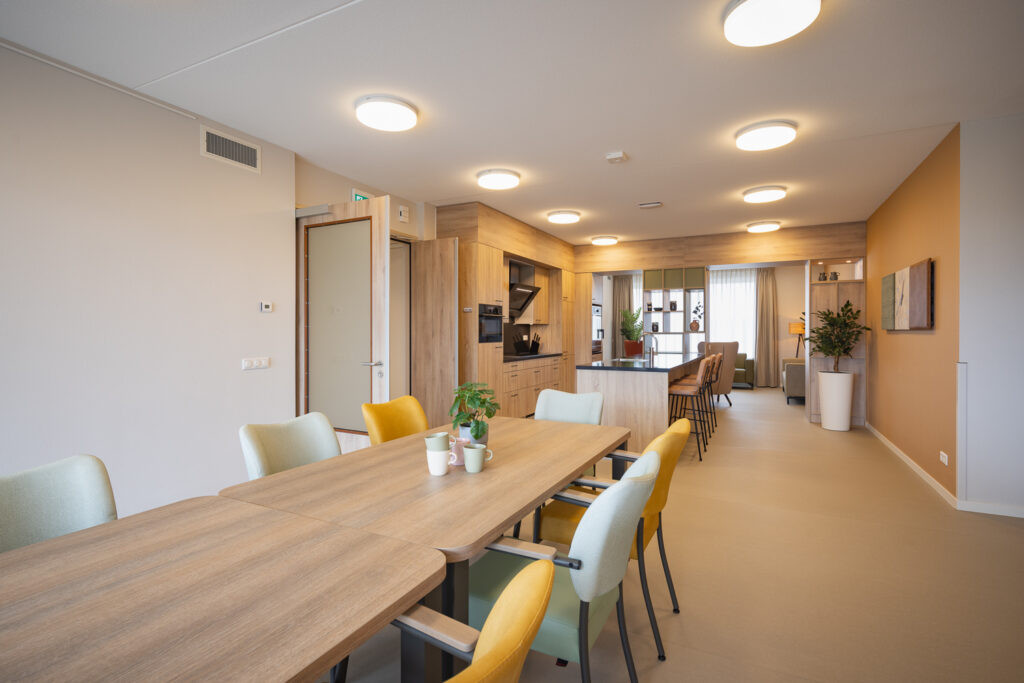 De reacties van bewoners spreken volgens Thessa boekdelen: ‘Ze voelen zich op hun gemak in de nieuwe omgeving. De kleurstelling is vrolijk maar rustgevend, de ruimtes voelen warm aan. Vooral de keukens op de tweede en derde verdieping vormen het sociale hart van de woningen. De barkrukken aan het kookeiland nodigen uit tot samenzijn – van het eerste kopje koffie tot het laatste gesprek van de dag. Op de derde verdieping is de animo voor deze plek zó groot, dat er inmiddels extra krukken zijn besteld. Ook over het zitcomfort van banken, fauteuils en eetkamerstoelen is men enthousiast. En hoewel er altijd individuele voorkeuren blijven – zoals een bewoner die een iets lagere bank prettiger had gevonden – is het geheel afgestemd op de behoeften van een diverse groep.’