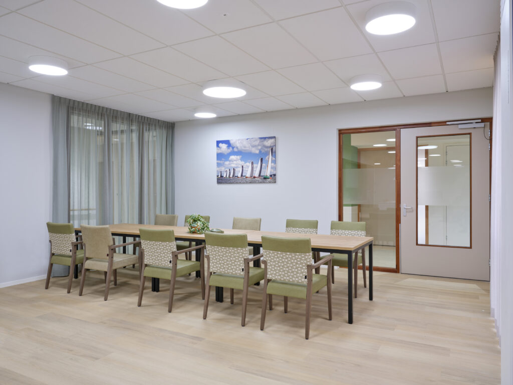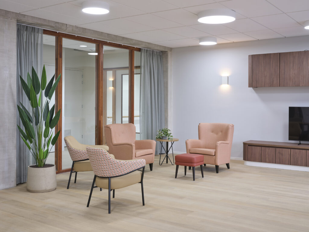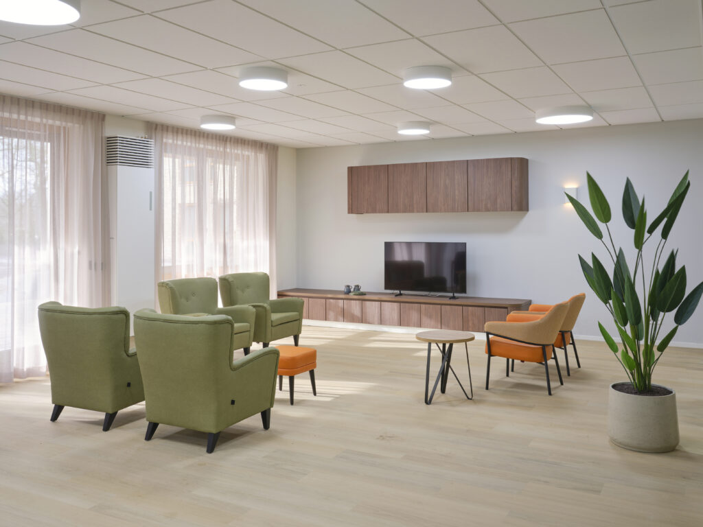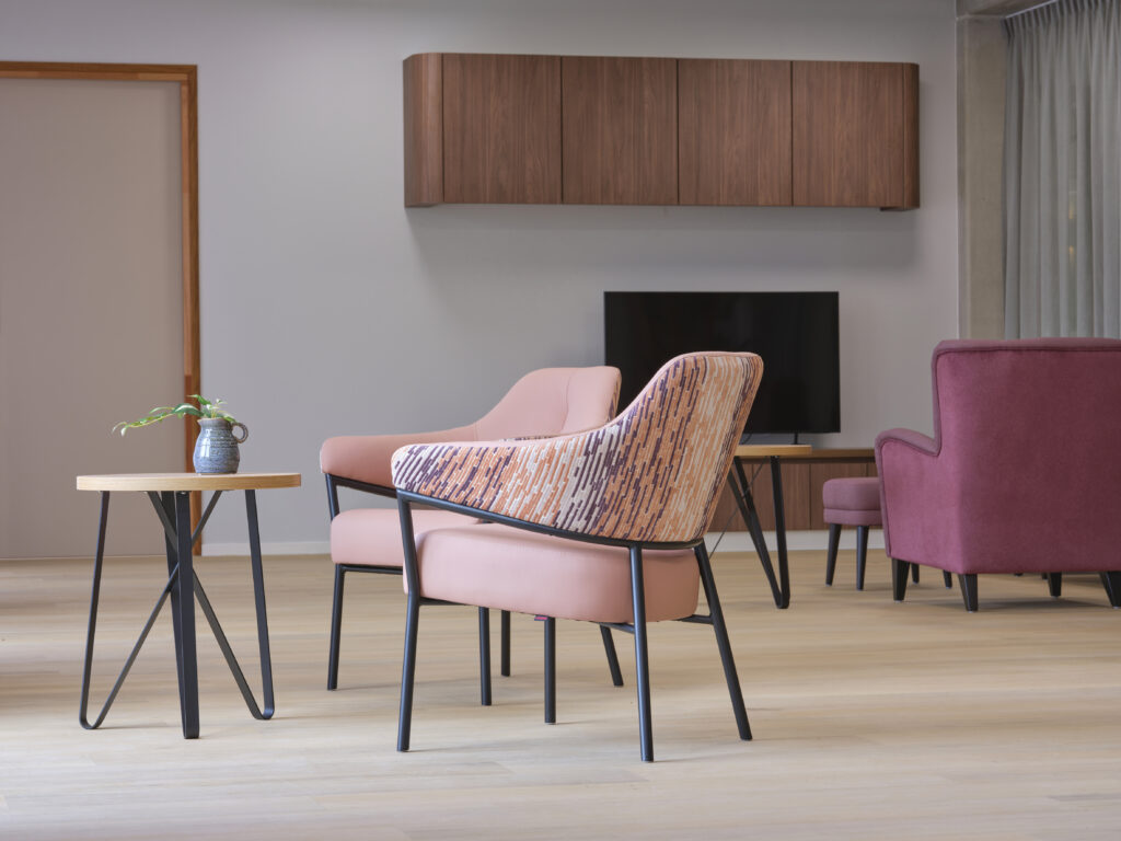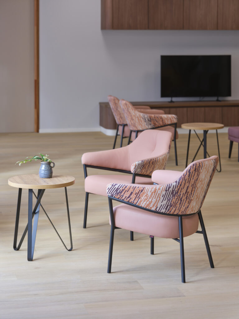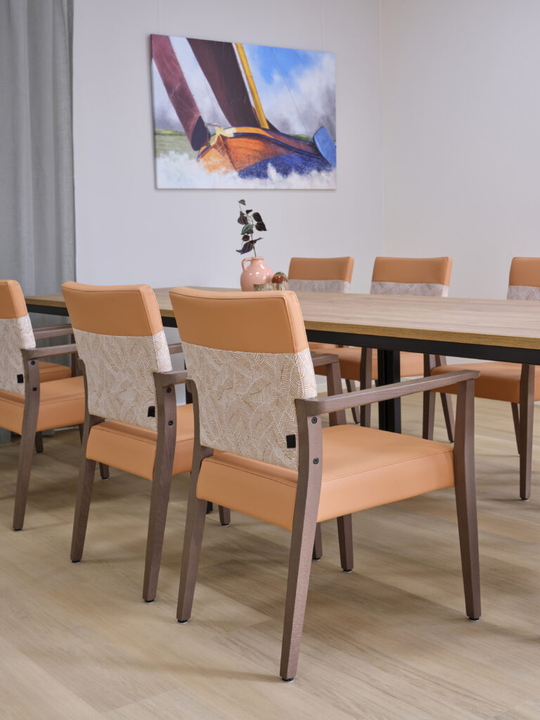 Het meubilair is zorgvuldig geselecteerd op basis van comfort, esthetiek en functionaliteit. Accountmanager Bas van de Pavert: ‘De architect kwam met een sterke visie. Wij hebben die verrijkt met een meubilairvoorstel dat inspeelt op de kleuren en vormen van het gebouw. De vlindervorm van bovenaf inspireerde bijvoorbeeld de kleurstelling van het meubilair. Een opvallend element is de hangende kunstbeplanting in het restaurant, evenals het fraaie maatwerk in woon- en cliëntenkamers.’