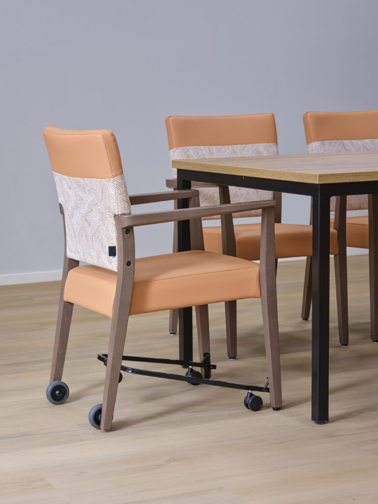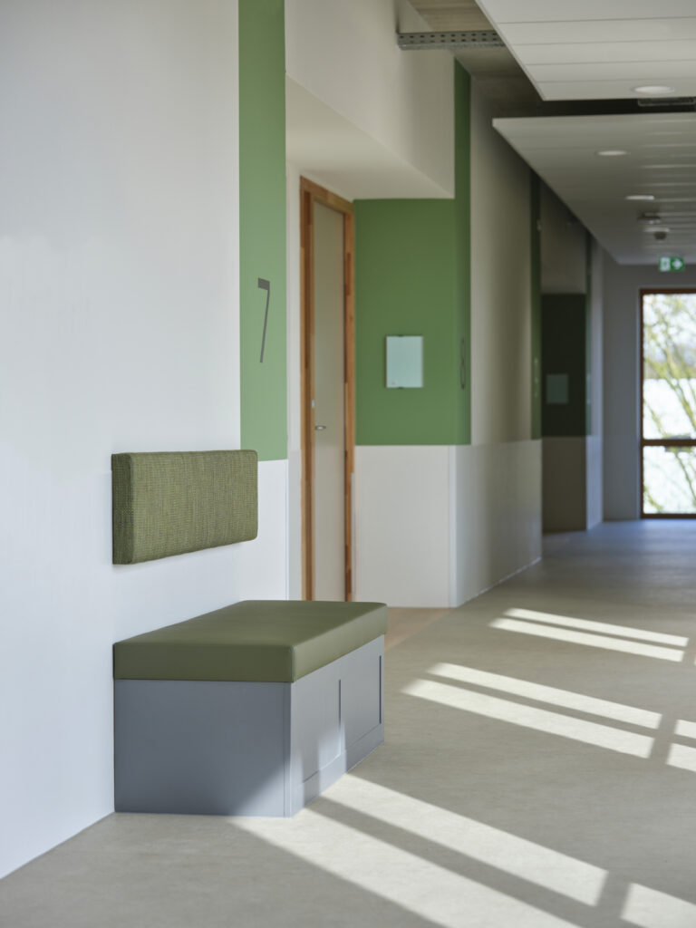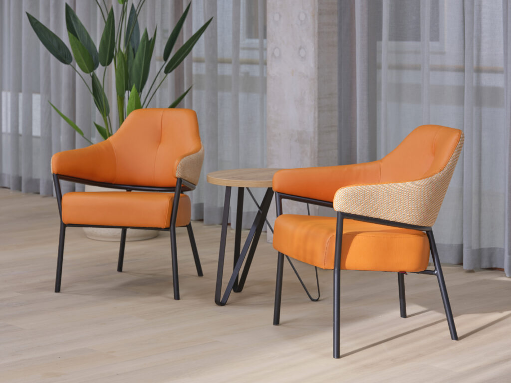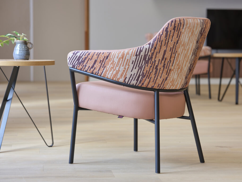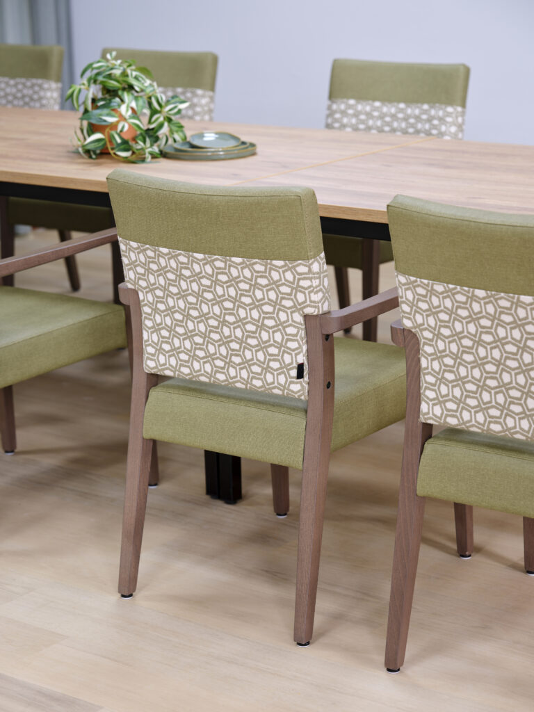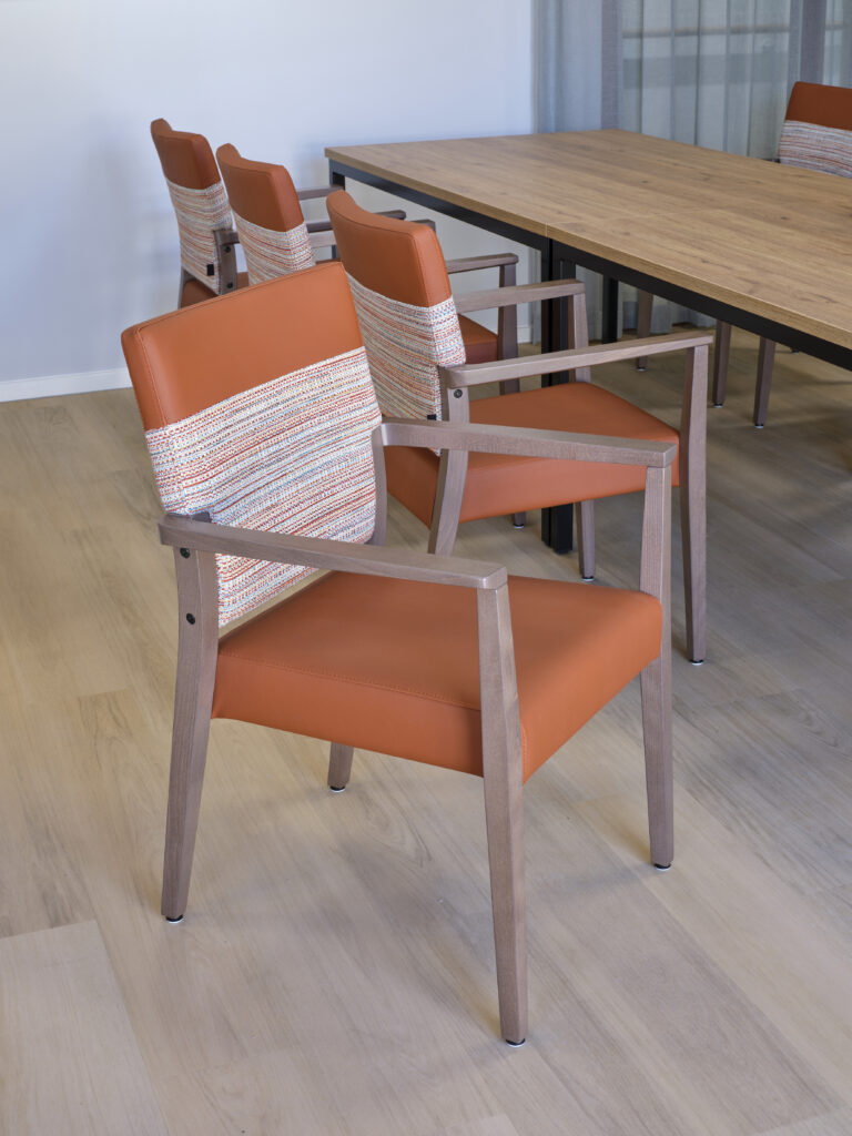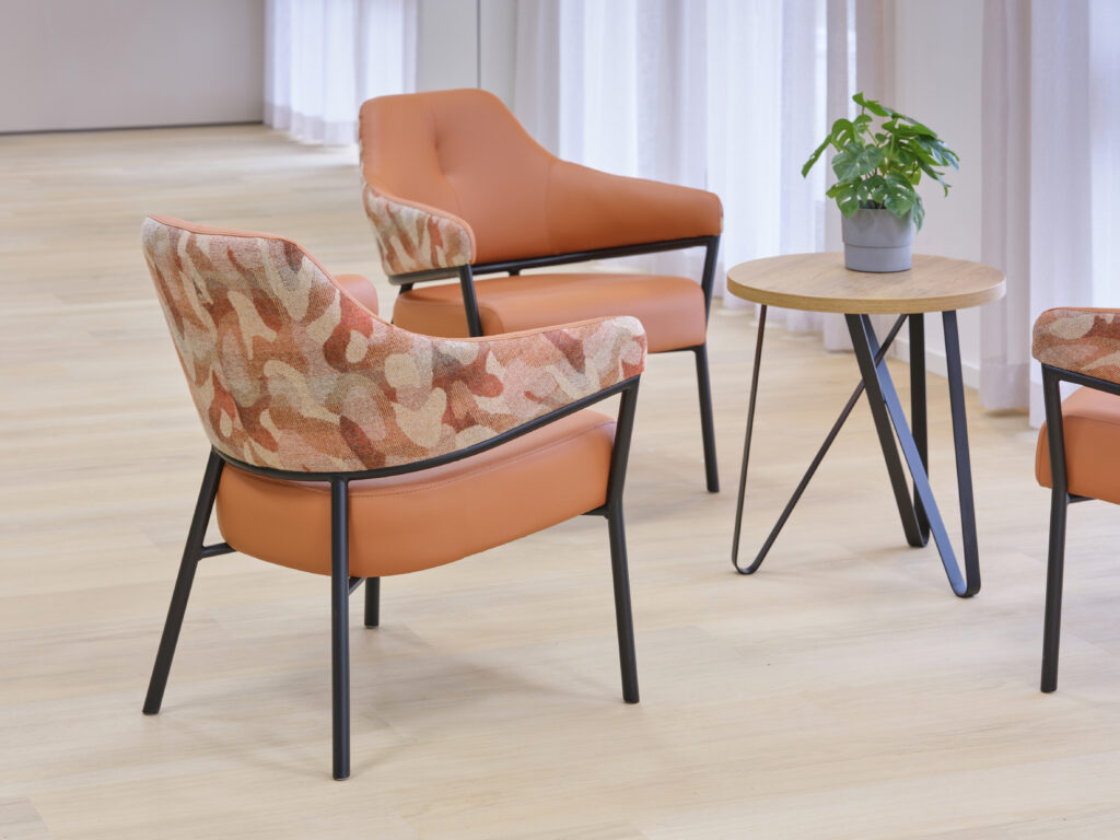 Het meubilair is zorgvuldig geselecteerd op basis van comfort, esthetiek en functionaliteit. Accountmanager Bas van de Pavert: ‘De architect kwam met een sterke visie. Wij hebben die verrijkt met een meubilairvoorstel dat inspeelt op de kleuren en vormen van het gebouw. De vlindervorm van bovenaf inspireerde bijvoorbeeld de kleurstelling van het meubilair. Een opvallend element is de hangende kunstbeplanting in het restaurant, evenals het fraaie maatwerk in woon- en cliëntenkamers.’