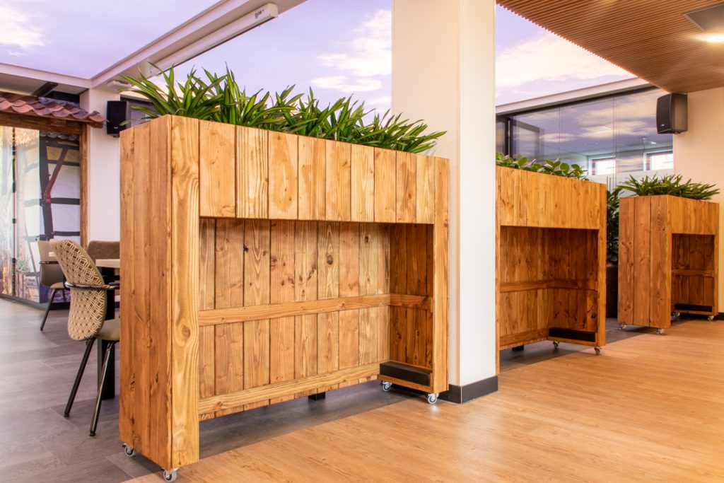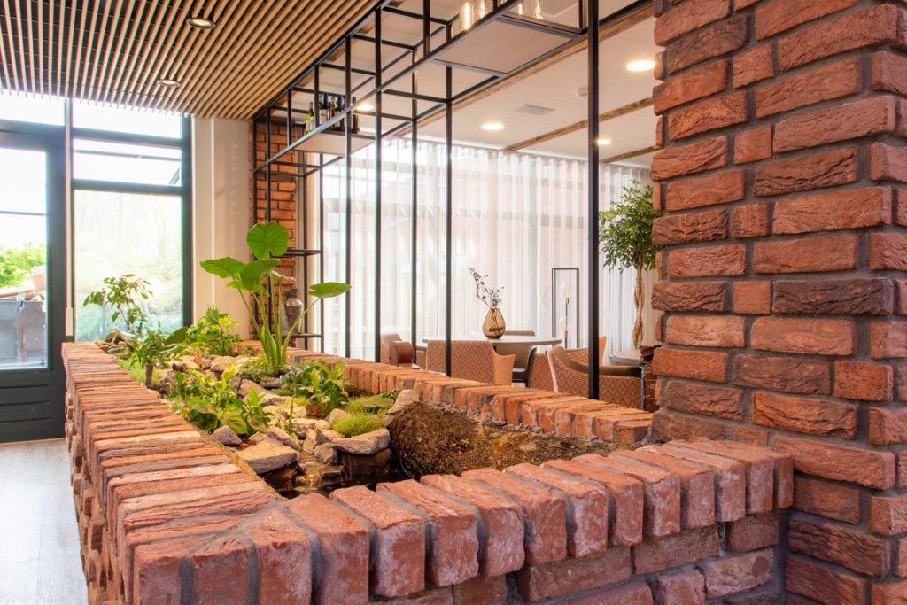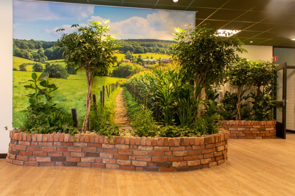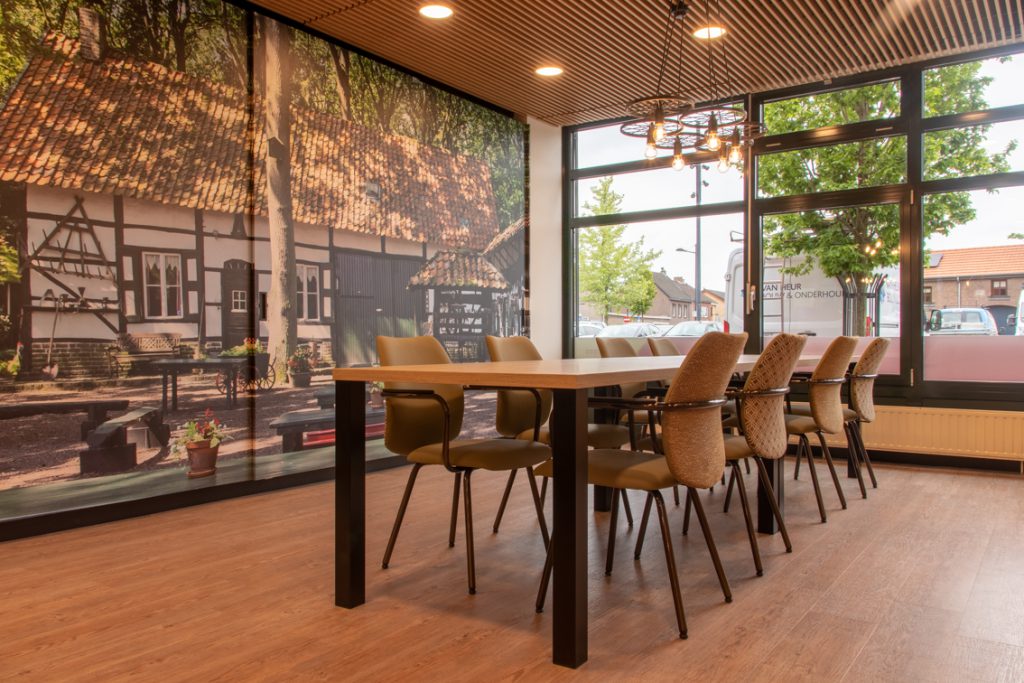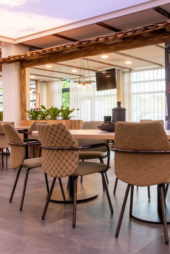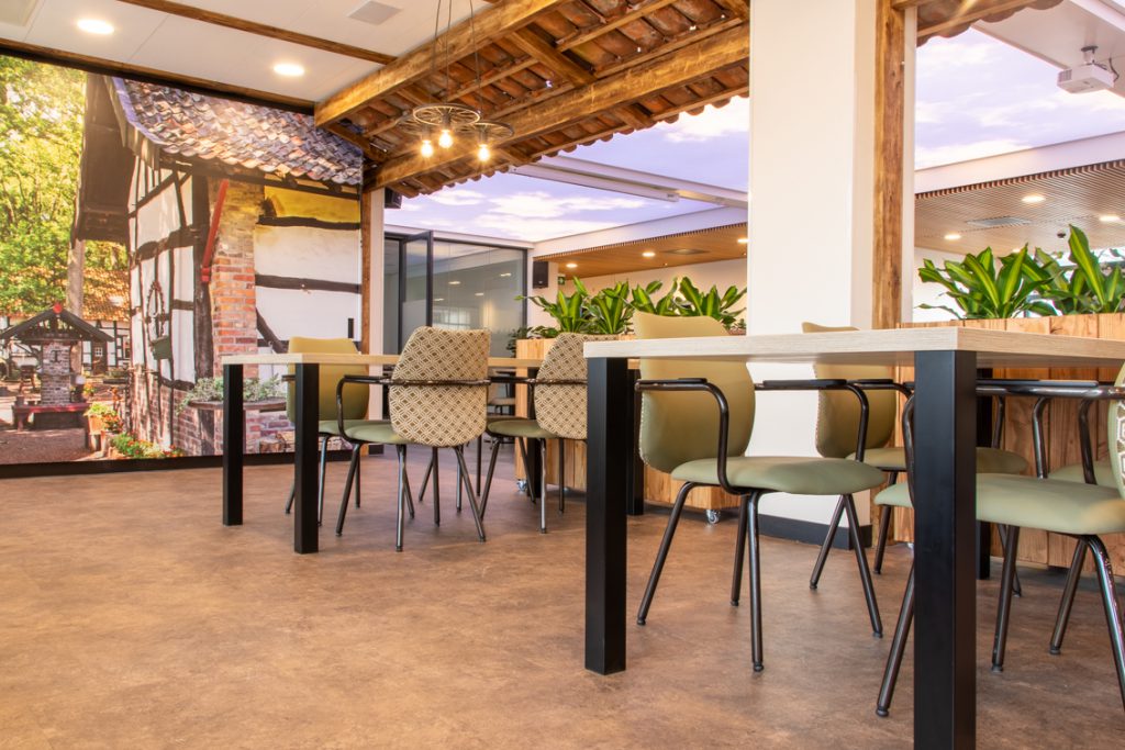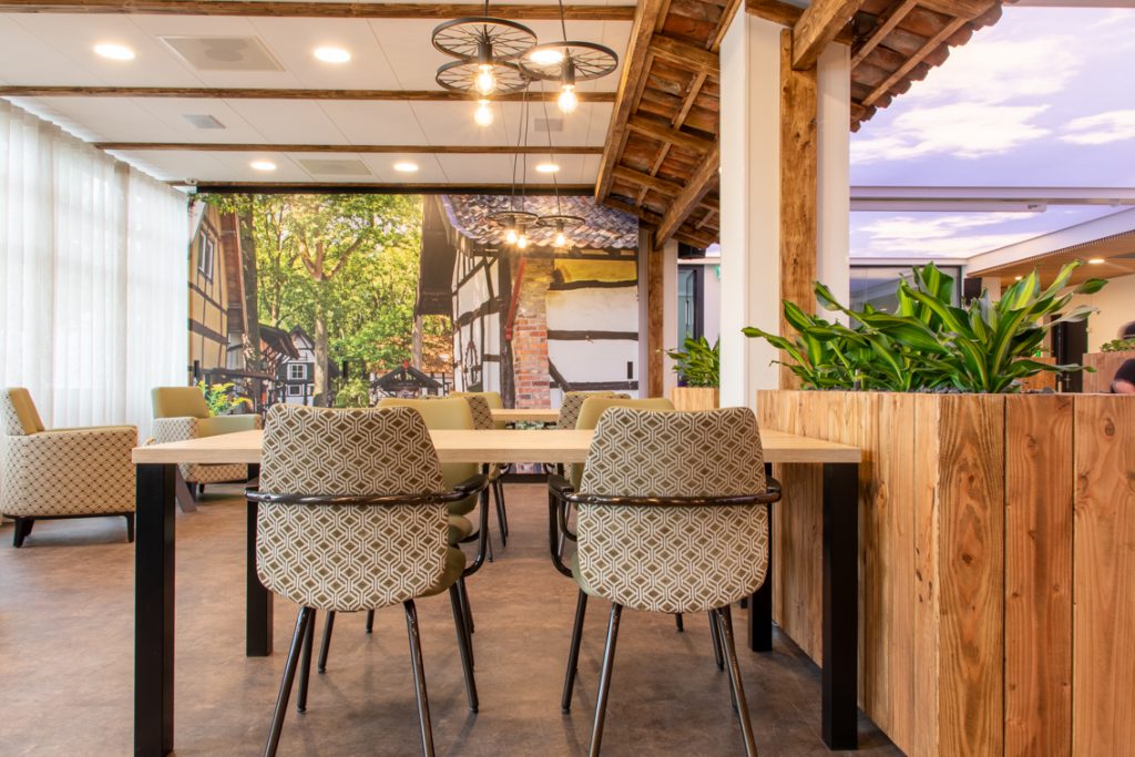 In de centrale ontmoetingsplek van het zorgcentrum op de begane grond wordt door middel van diverse thema's 'buiten' naar binnen gebracht. Grote uitdaging was eenheid te brengen in het gebouw: waar voorheen met name de begane grond uit diverse afzonderlijke ruimtes bestond, is deze tot één grote ruimte getransformeerd: een dorpsplein met daaromheen diverse thema's uit de omgeving zoals de 'Schinveldse Bossen', de 'Roode Beek" en 'Nonke Buusjke".