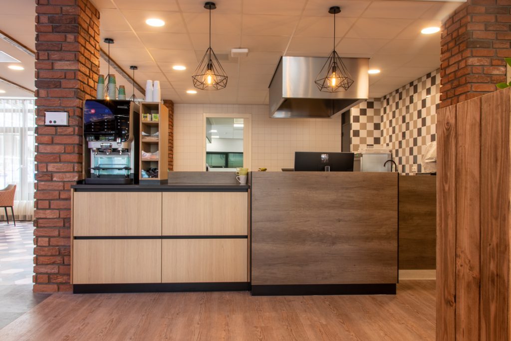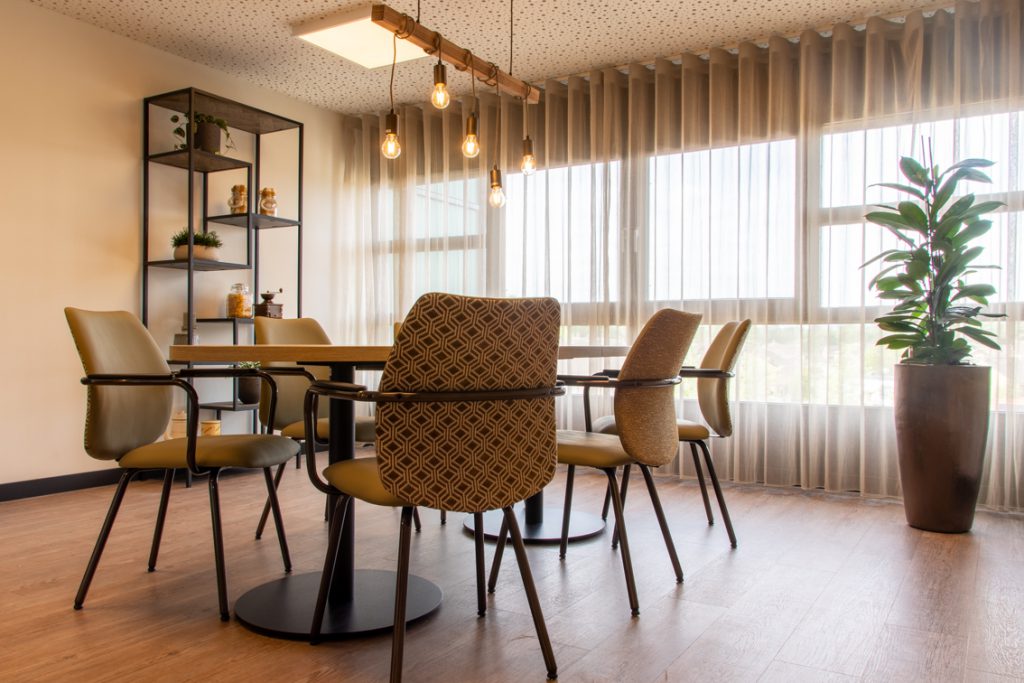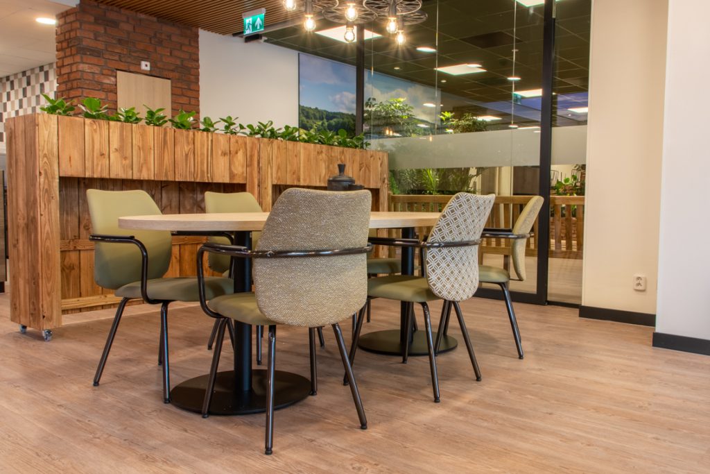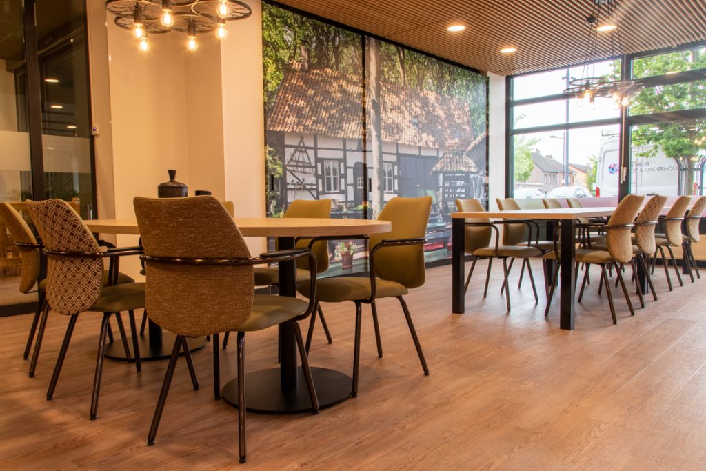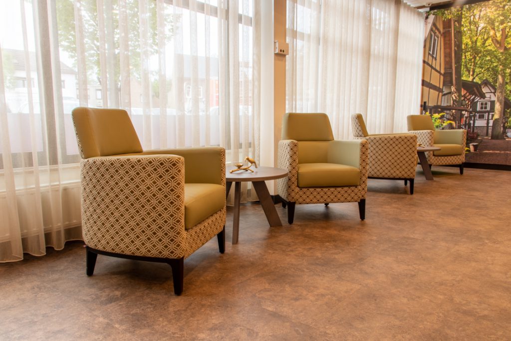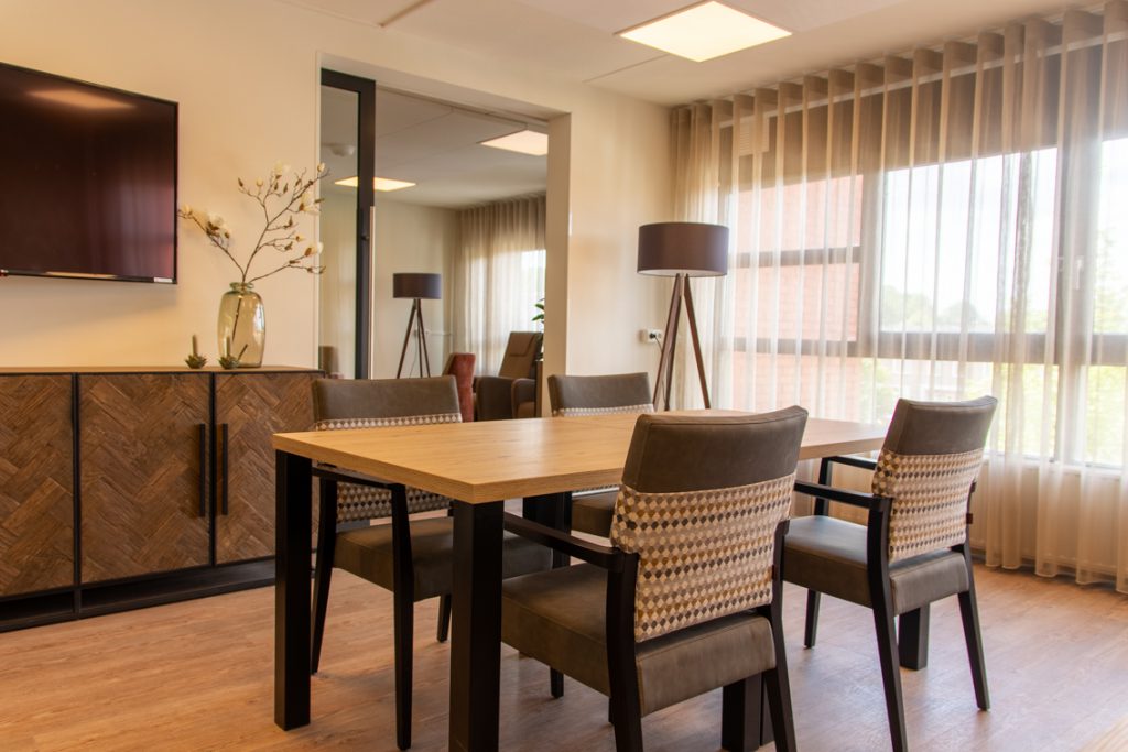 Cliënten die bij Aan de Bleek wonen hebben baat bij een prikkelarme omgeving. Warmte en diversiteit is gecreëerd door te kiezen voor verschillende materialen en structuren zoals pvc-vloeren met hout- en steenmotief alsook afneembare stoffen die een zachte uitstraling hebben.