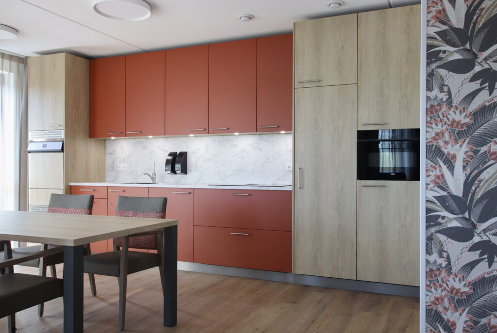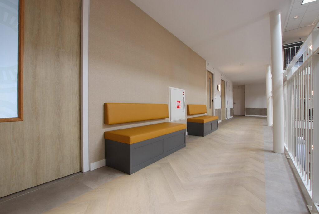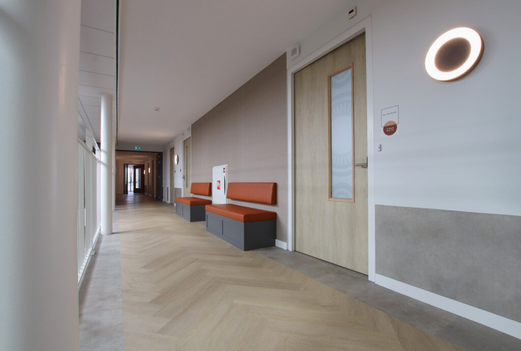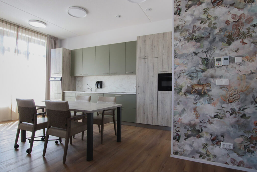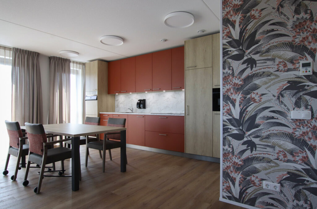‘De Stadshaven van Goes is een plaatje', vertelt Anny. ‘De jachthaven ligt midden in de stad, heeft aan de kade de mooiste pakhuizen en is een bron van inspiratie geweest bij het vormgeven van het interieurconcept. In dit concept staan het met elkaar samenbrengen en verbinden van het stadshart, het Atrium en de straten centraal. Het zorgcentrum telt drie verdiepingen. Elke verdieping heeft een eigen, kenmerkende kleur gekregen: groen, okergeel en terra. ‘Deze accentkleuren zijn in verschillende elementen op de afdeling terug te vinden: in de keuken, meubelen en op de gangen. Met de werkgroep hebben we een prettige samenwerking beleefd en ook de bewoners hebben we betrokken in het creatietraject. Met verschillende dessins behang en gordijnen zijn we twee dagen op locatie geweest om de bewoners de gelegenheid te geven hun eigen appartement in te richten. Dit hebben we samengedaan.’