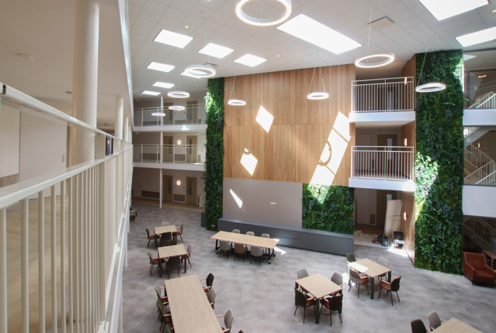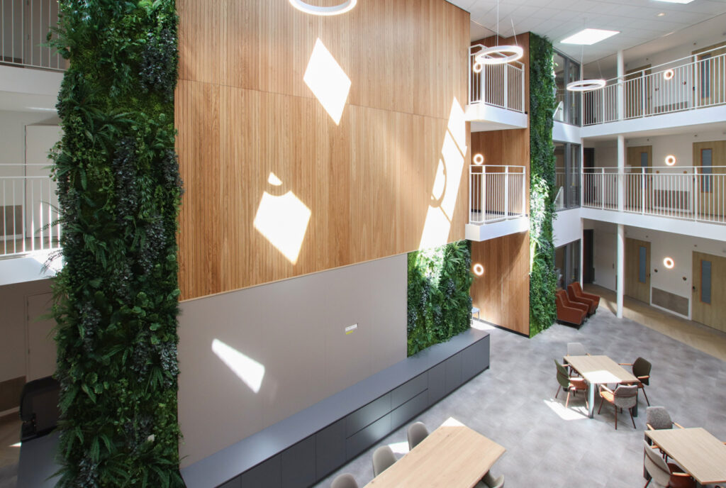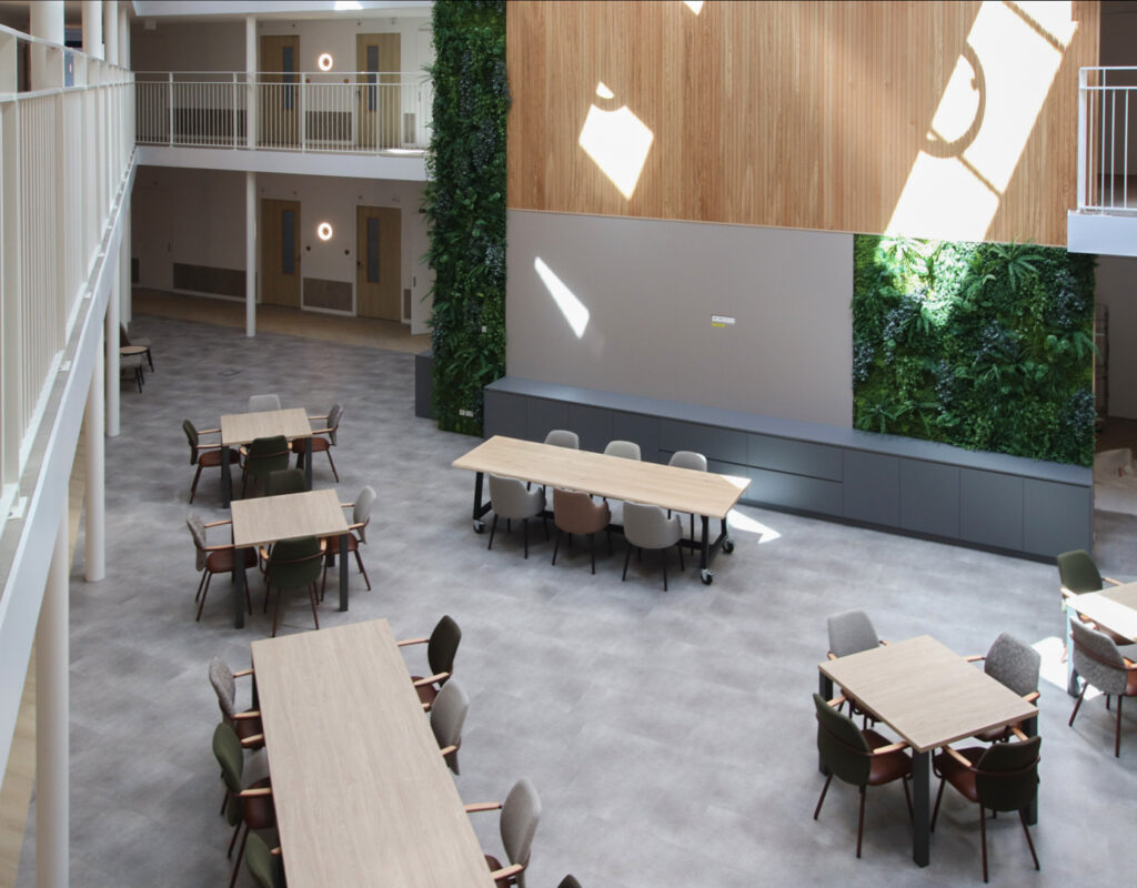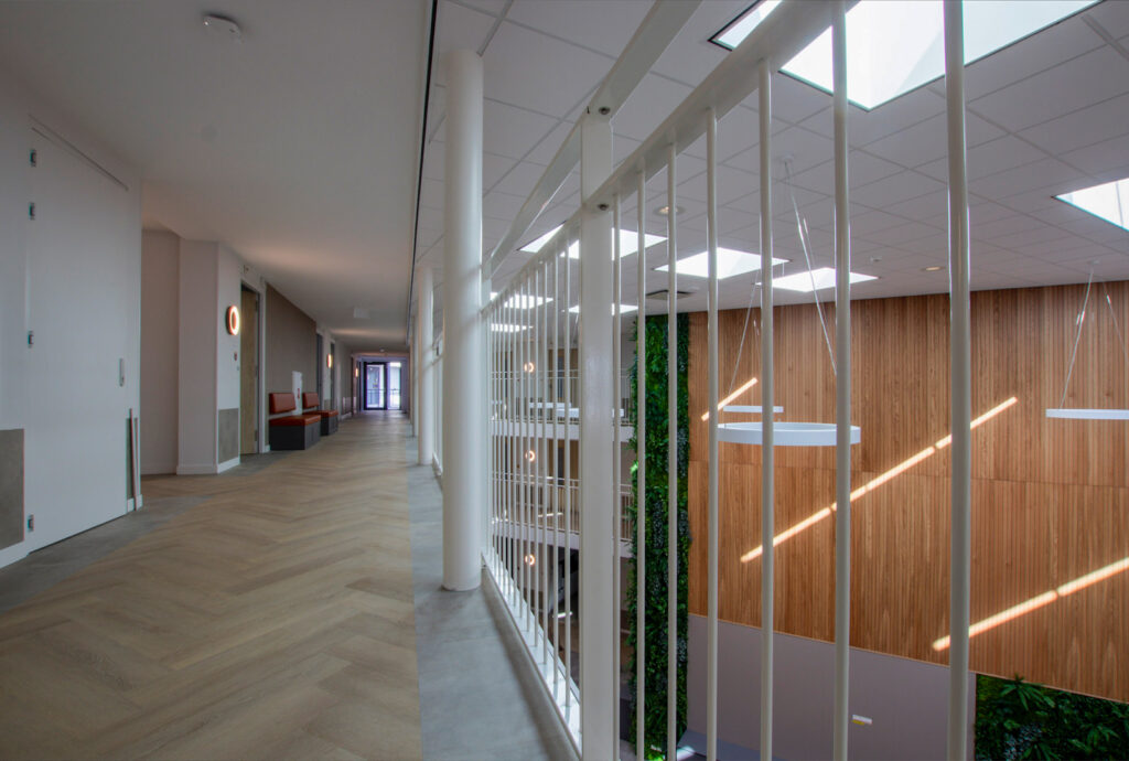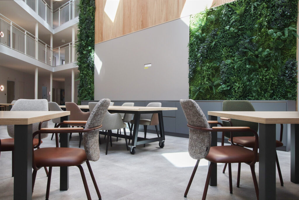 De Manhuistuin - de meest idyllische plek van de stad waar de rondom gelegen gebouwen tot 1977 functies hadden van klooster tot weeshuis en van bejaardenhuis tot muziekschool – is een oase van rust. ‘Deze groene rustplek, in het midden van de drukke stad, inspireerde ons de gezamenlijke binnenruimte, Het Atrium, vorm te geven als ‘stadshart’ van Residence 't Gasthuis. Een plek voor ontmoetingen, een centraal plein waar mensen kunnen samenkomen.’ De woonkamers en appartementen sluiten aan op dit middelpunt. ‘De metershoge wand met groendecoratie en sfeervolle, houten latten is een eyecatcher, een groene oase waarop elke verdieping uitkijkt. Op de gangen zijn tegen de wanden banken geplaatst in de kenmerkende kleur van die verdieping. Waar je ook plaatsneemt, je bent verbonden met en kunt genieten van, dit groene hart.’